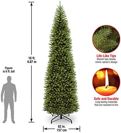 This Kingswood Fir Slim Artificial Green Christmas Tree is 16 feet tall with a 62 inch base diameter. Featuring hundreds of individually crafted branch tips to create full bodied branches, this tree is designed to look and feel lifelike.