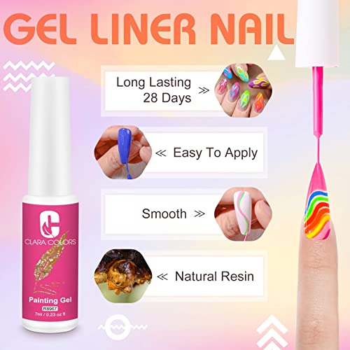 🌸HOW TO USE IT: Clara Colors 3 in 1 Nail Art Gel can use as nail polish, nail draw liner, gel art paint. The brush is slim as well as high elasticity that can draw any pattern. Need cured by UV/LED nail lamp. Suitable for natural nails, false nails tips, acrylic nails. Perfect for professional or DIY nail art.